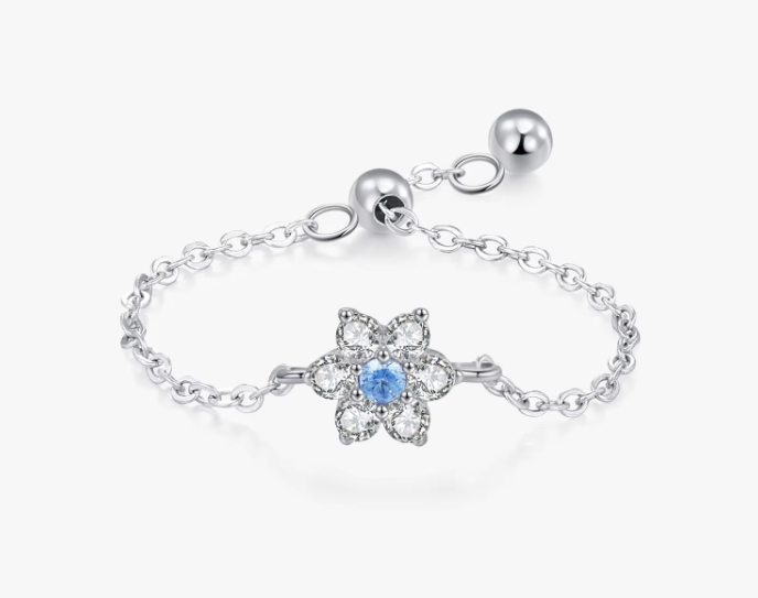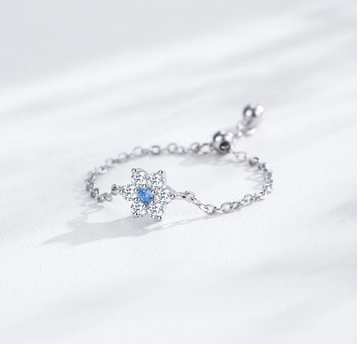 La bague Aube bleue, fait partie de la collection de bague chaîne réglable.