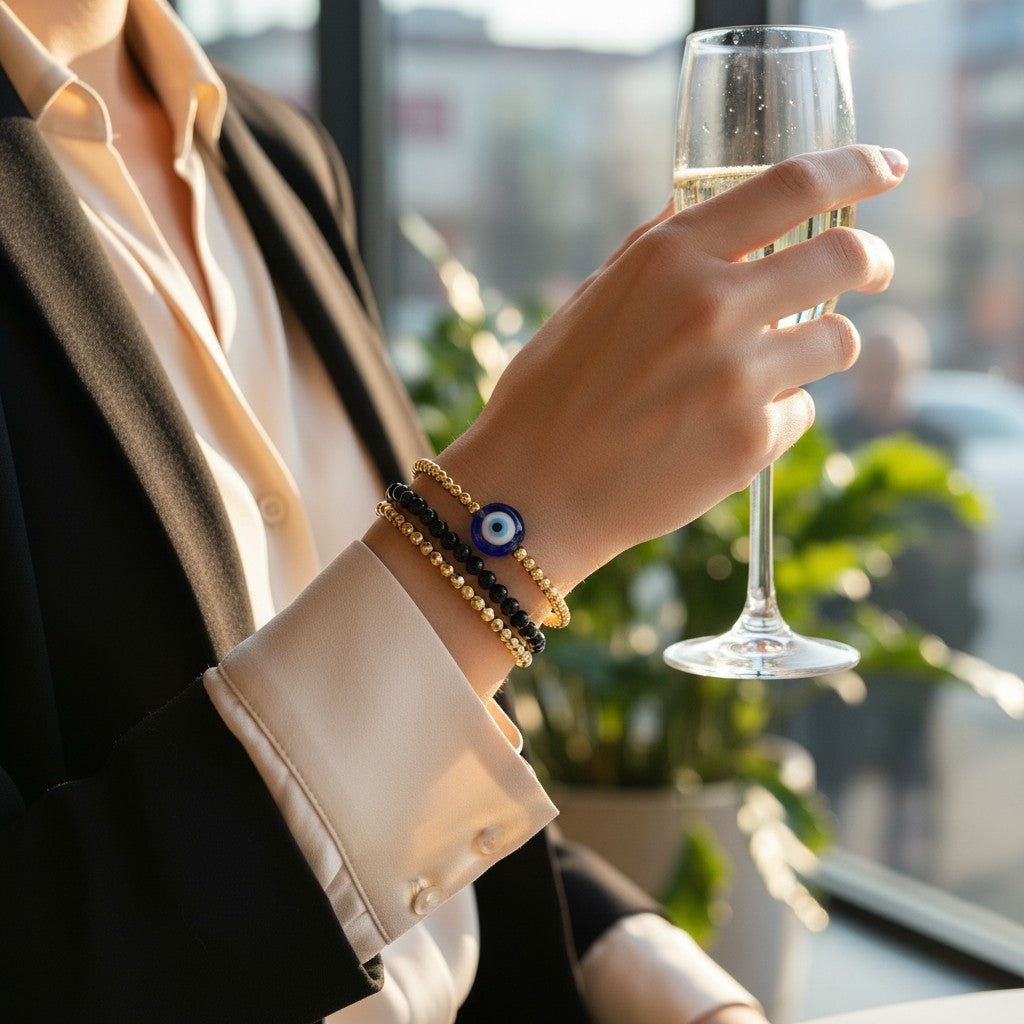 Description : Bracelet composé de perles dorées fantaisie, mettant en valeur une perle en verre représentant l'œil de protection (couleurs au choix).